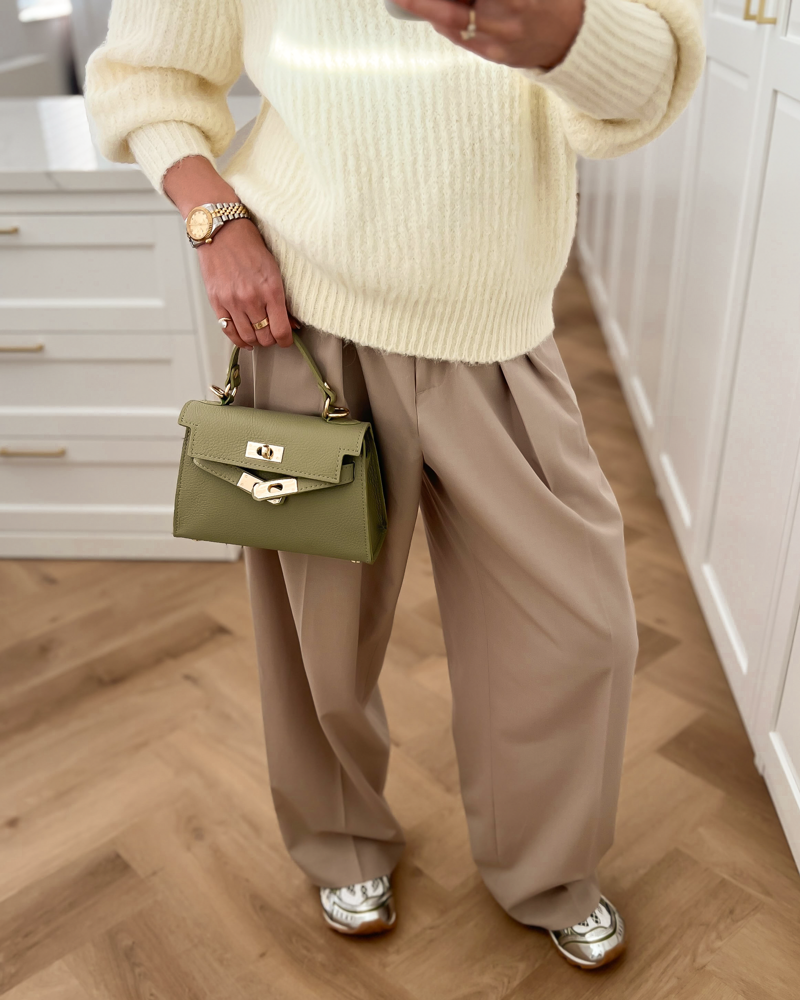 Echt leren mini tas. De tas heeft op de voorkant een draaisluiting en is afgewerkt met goudkleurige hardware. Dankzij het afneembare en verstelbare hengsel kan de tas ook als crossbody gedragen worden. De tas heeft een hoofdcompartiment met aan de binnenzijde een ritsvakje.
