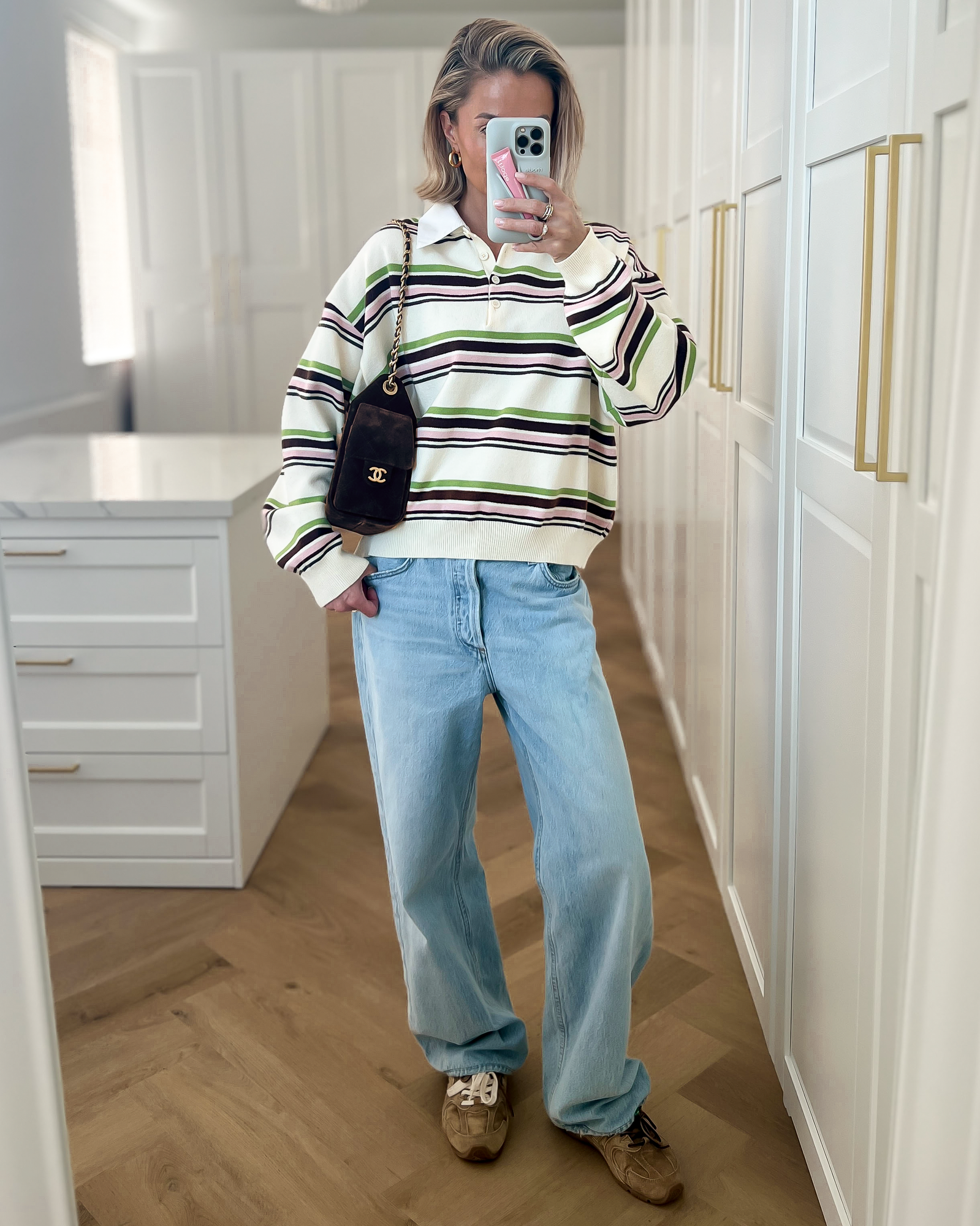 CARTER - Collar Striped Polo Top in Off White & Green